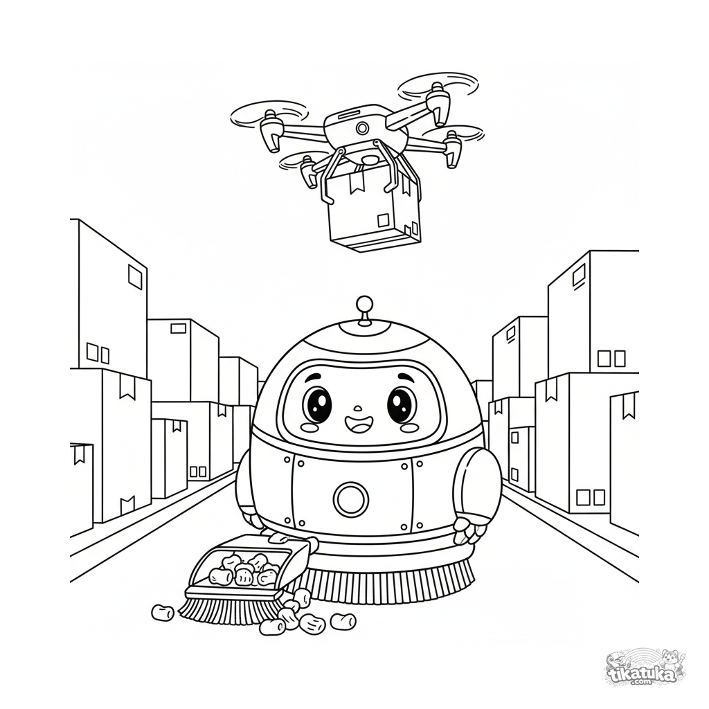 Página para colorir para crianças 7-9: um robô zelador redondo e sorridente varre um corredor entre prateleiras altas em um armazém. Um drone de carga voa acima. Cena dinâmica.