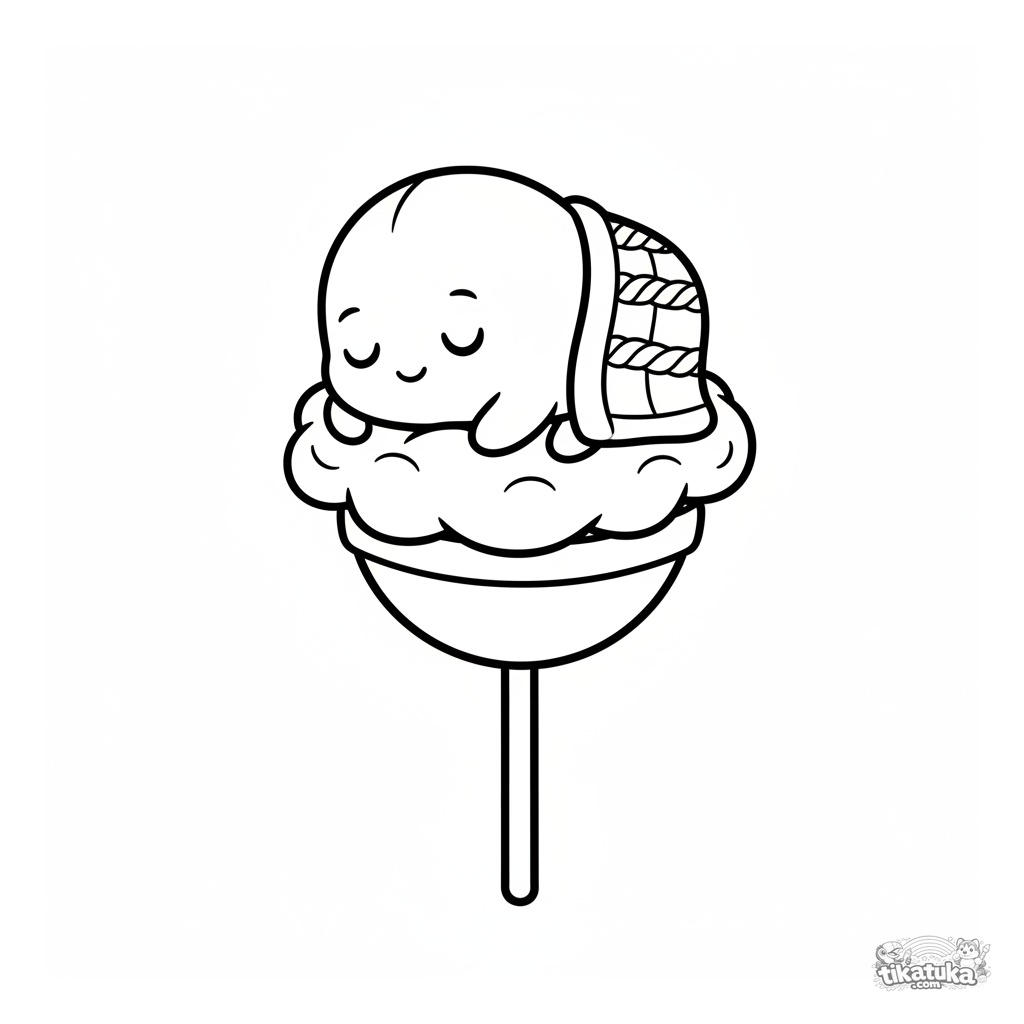 Página muito simples para colorir para crianças pequenas 2-3: um micróbio redondo e fofinho dorme em uma nuvem de algodão-doce em um pirulito gigante. Formas grandes.