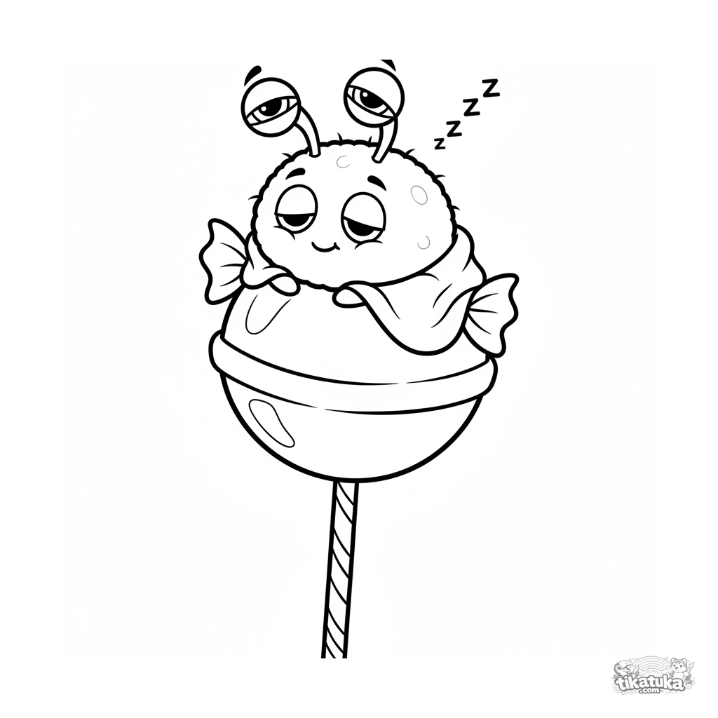 Página para colorir simples para bebês 2-3 anos: um micróbio redondo de pelúcia com olhos engraçados de talco dorme profundamente em um pirulito grande. Formas grandes, contornos grossos.