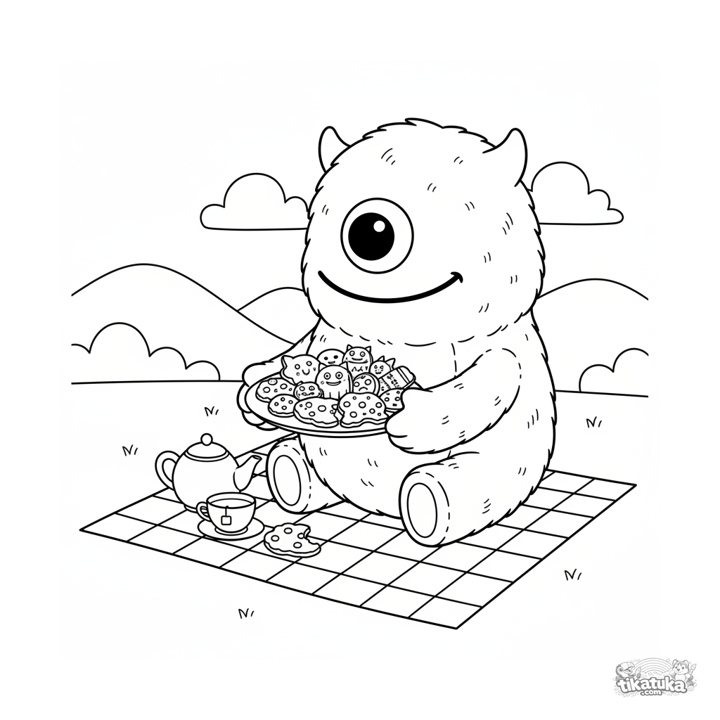 Página para colorir para crianças de 4-6 anos: um monstro redondo e fofinho com um olho oferece um prato de biscoitos em um piquenique. Cena calorosa sobre amizade e generosidade.