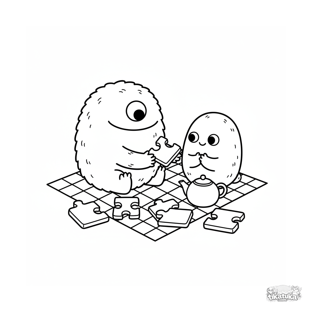 Página para colorir para crianças 4-6: um monstro chibi redondo compartilha um biscoito quebra-cabeça com um amigo no piquenique. Cena fofa sobre amizade.