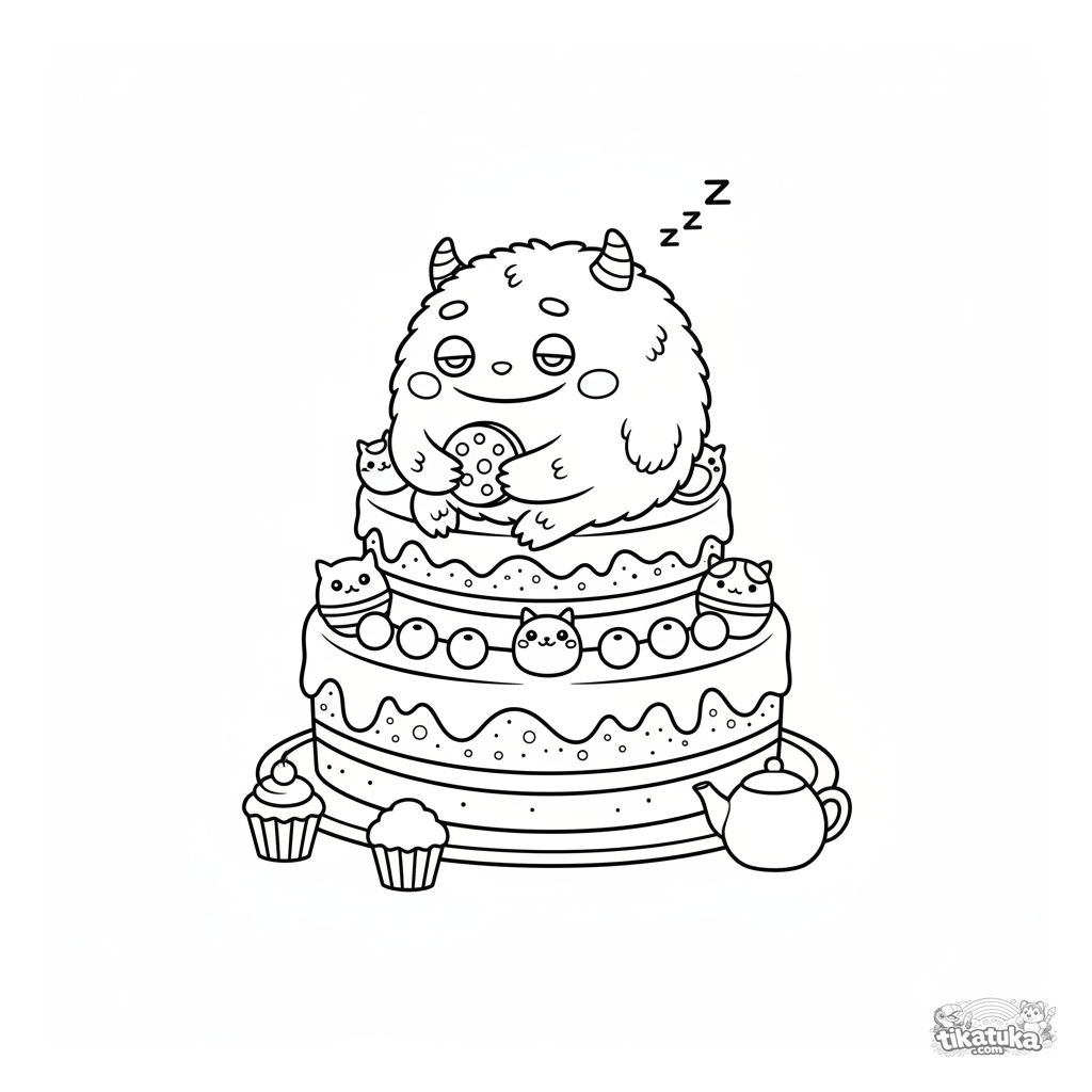 Página simples para colorir para bebês: um monstro redondo dormindo em um bolo grande em um piquenique. Formas grandes, detalhes mínimos, para 2-3 anos.