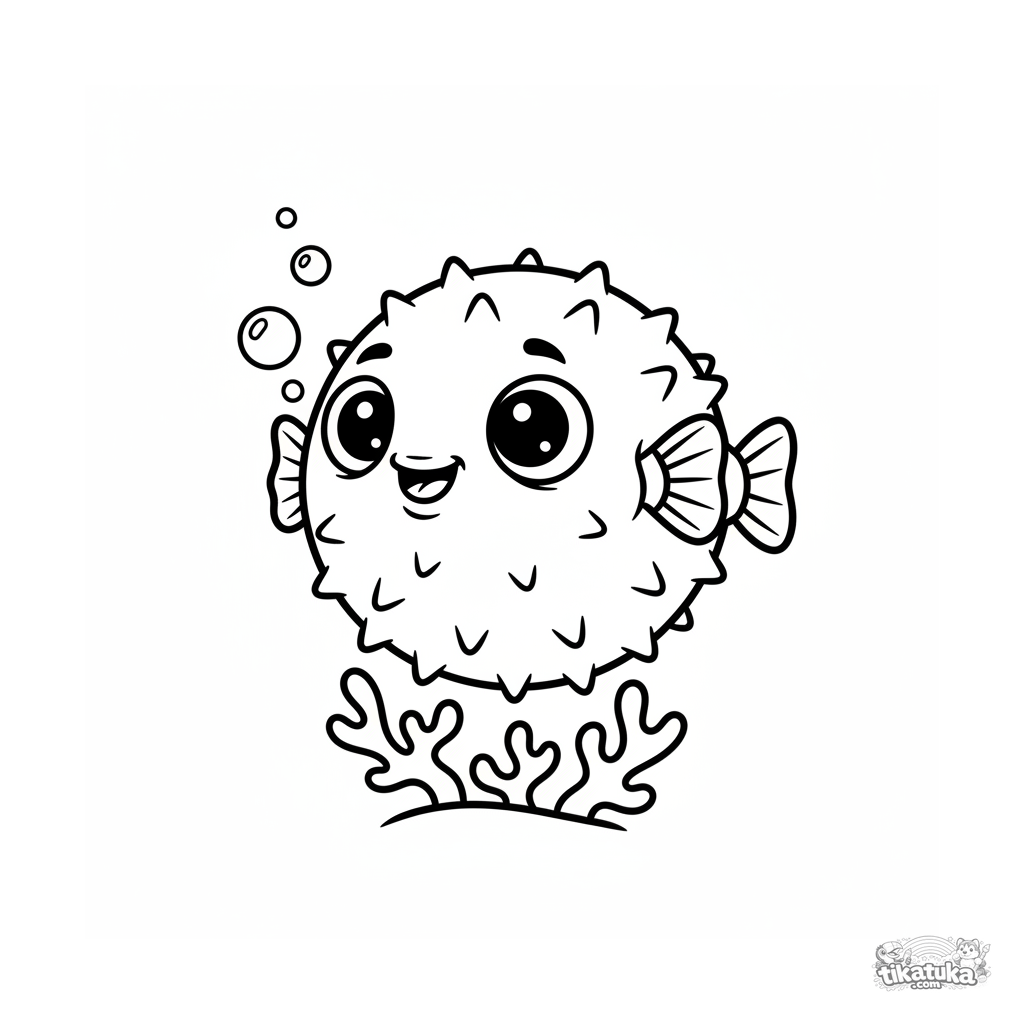 Página para colorir simples de um baiacu fofo inflando perto do coral em águas rasas ensolaradas. Para crianças pequenas de 2-3 anos.