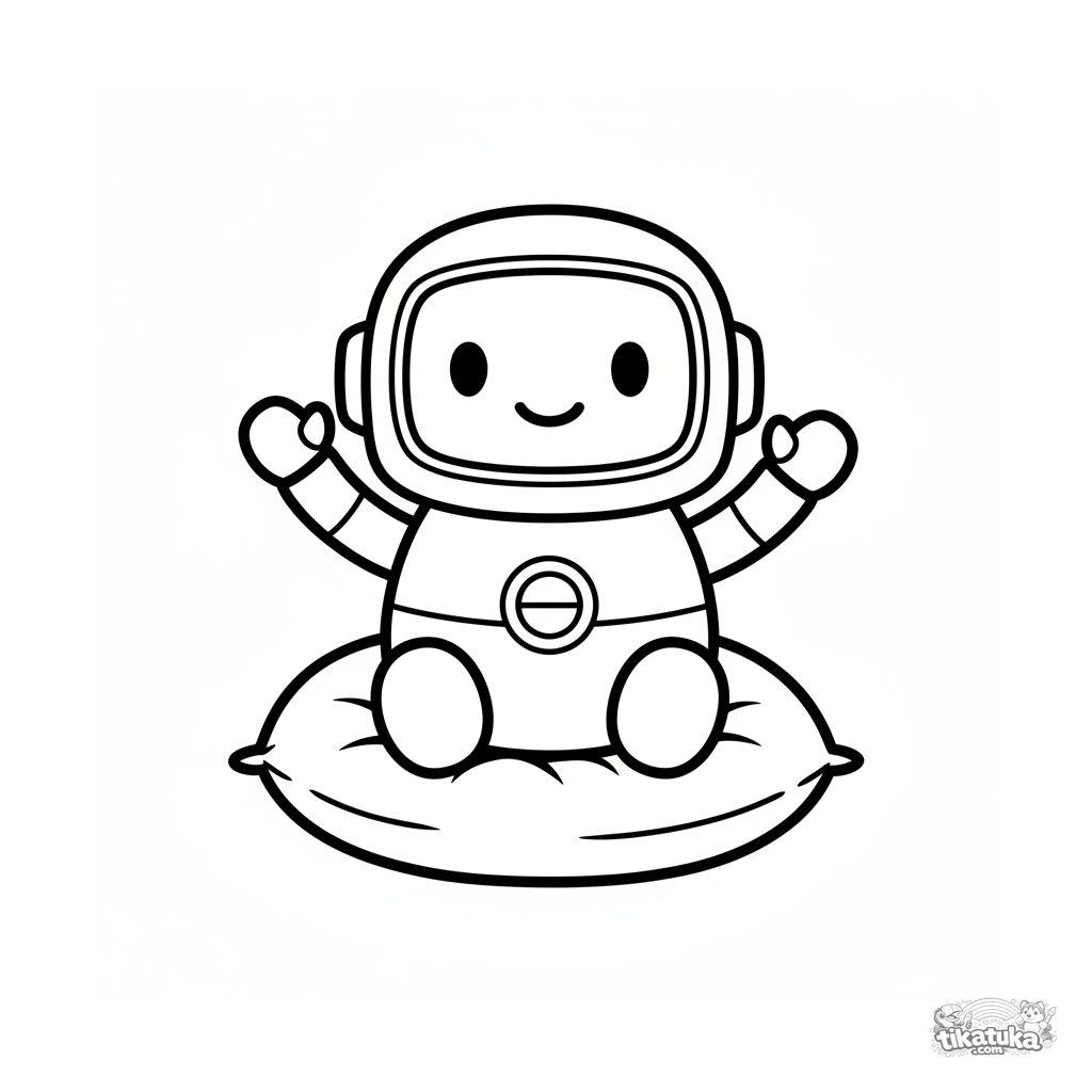 Página para colorir para crianças pequenas: um robô redondo e amigável acena de um travesseiro macio. Formas grandes e claras.