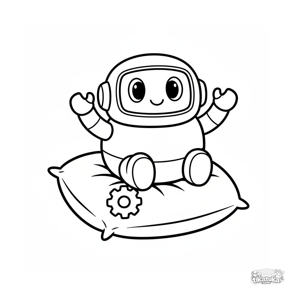 Página para colorir simples para crianças pequenas de 2-3 anos: um robô redondo e amigável acena enquanto senta em um travesseiro macio, com uma engrenagem ao lado. Formas grandes e claras.