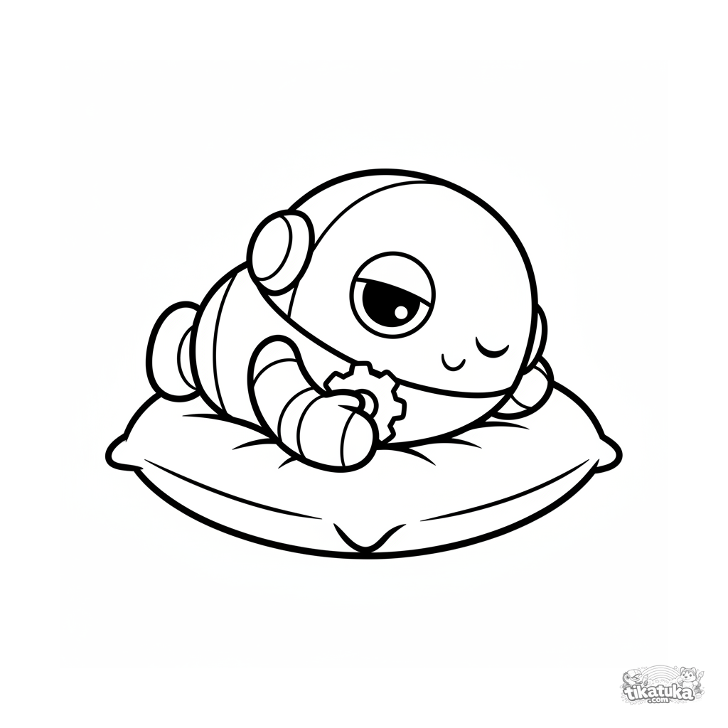 Página simples para colorir para bebês: um robô redondo e amigável descansa em um travesseiro. Formas geométricas grandes, poucas linhas.