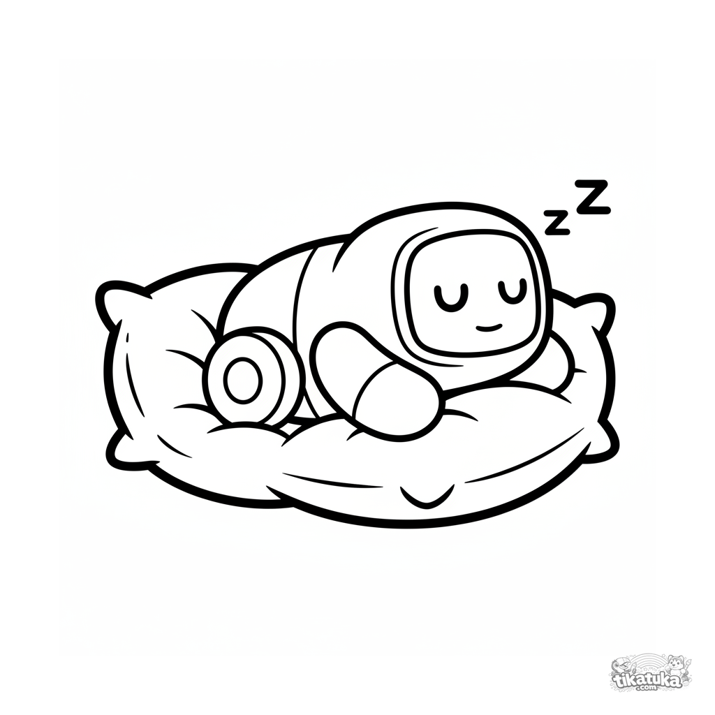 Página para colorir simples para crianças de 2-3 anos: um robô redondo e amigável cochila em uma almofada macia. Formas grandes e claras.
