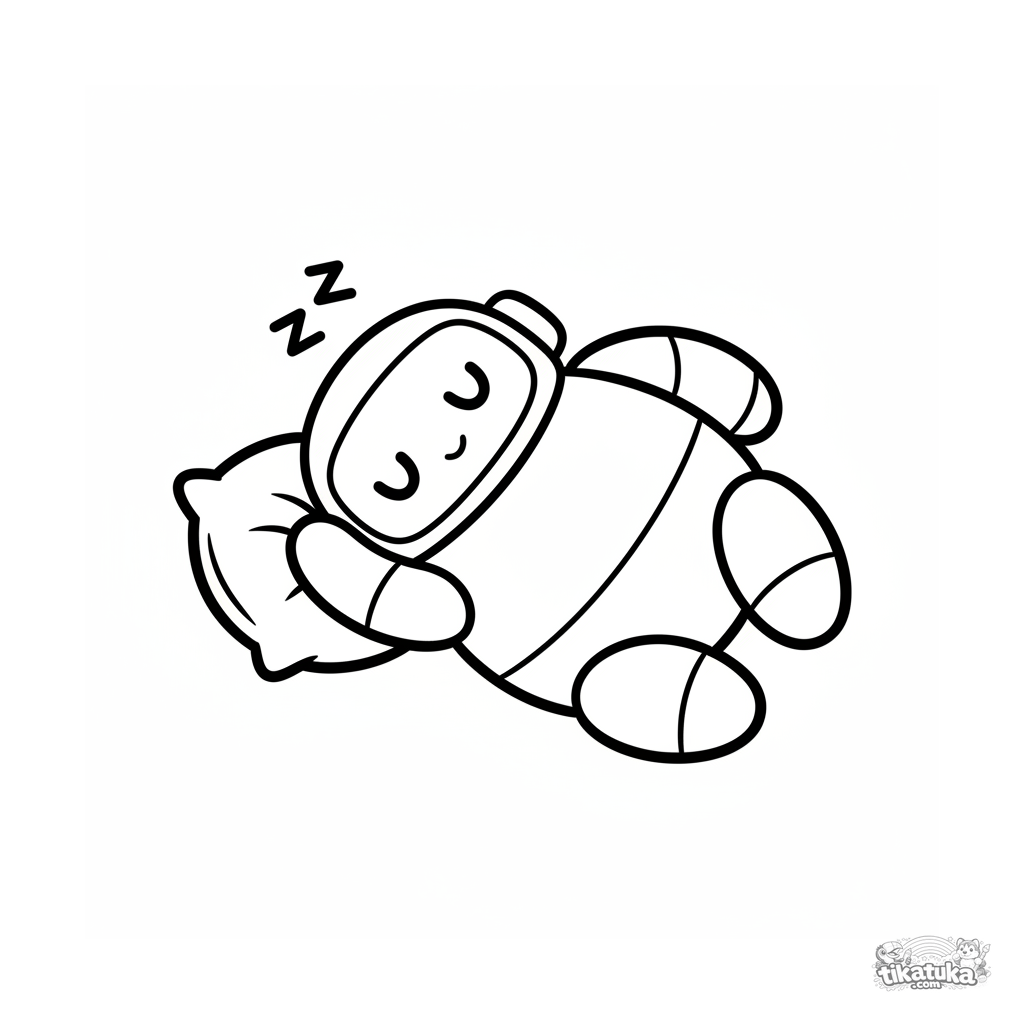 Página para colorir simples para crianças de 2-3 anos: um robô redondo e amigável dorme em um travesseiro grande e macio. Formas grandes e claras.