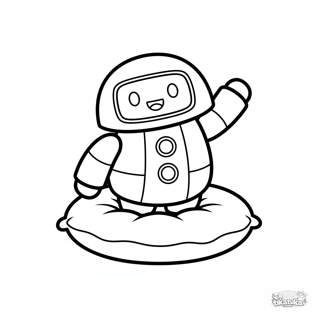 Página simples para colorir para 2-3 anos: um robô redondo e amigável acenando em pé em um travesseiro macio. Formas grandes e contornos claros.