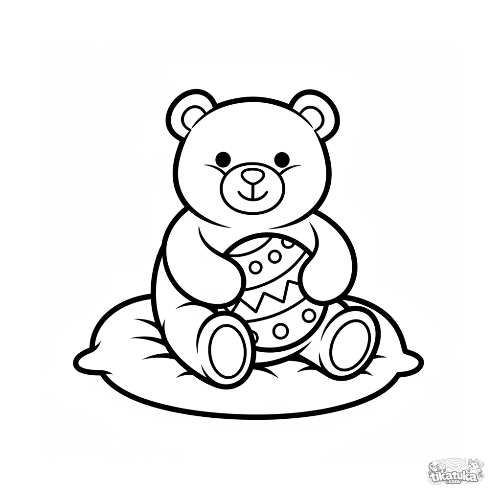Página simples para colorir para 2-3 anos: um ursinho de pelúcia abraça uma bola em um travesseiro macio. Contornos grandes e claros.