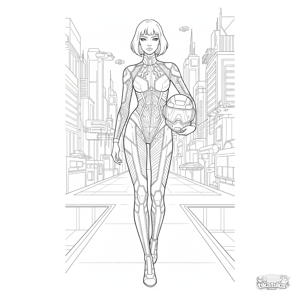 Página para colorir para meninas 10-12: uma modelo em um macacão cyberpunk detalhado caminha confiantemente em uma passarela de néon com cenário de cidade futurista.