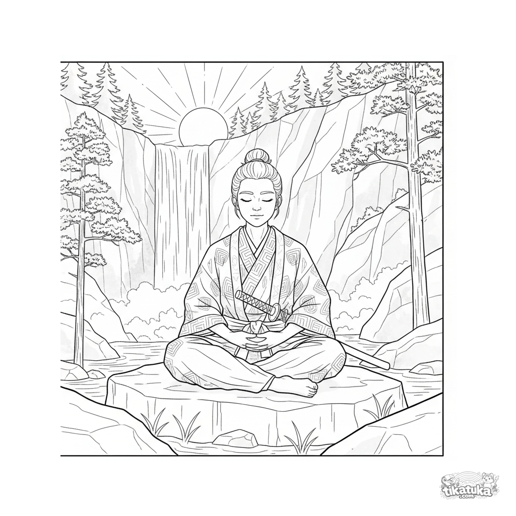 Página para colorir estilo anime detalhada: um aprendiz de samurai medita com uma espada embainhada junto a uma cachoeira poderosa ao crepúsculo. Paisagem complexa com pinheiros e névoa para 10-12 anos.
