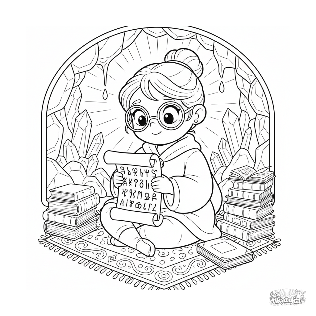 Página para colorir para 7-9 anos: uma princesa erudita estuda um pergaminho antigo em uma biblioteca secreta dentro de uma caverna de cristal.