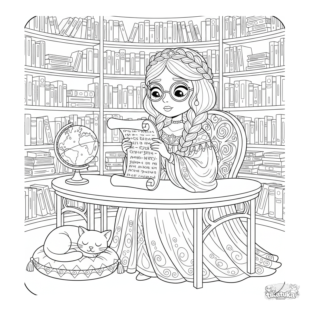 Página para colorir para crianças mais velhas 10-12: uma princesa erudita lendo pergaminhos antigos em uma biblioteca da torre. Estantes detalhadas, um globo e um gato dormindo.