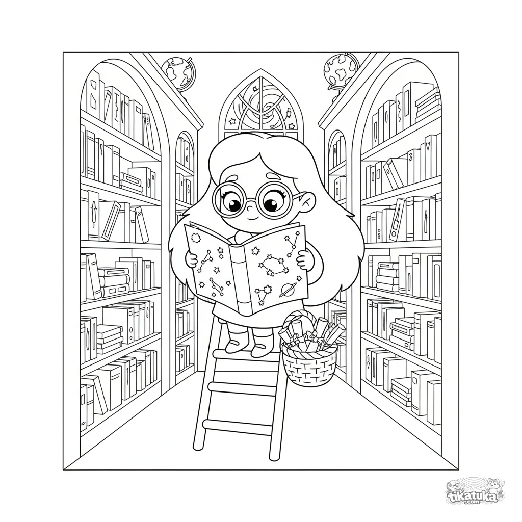 Página para colorir para crianças 4-6: uma princesa erudita com óculos lê um atlas gigante em uma biblioteca antiga. Cena divertida em uma escada.