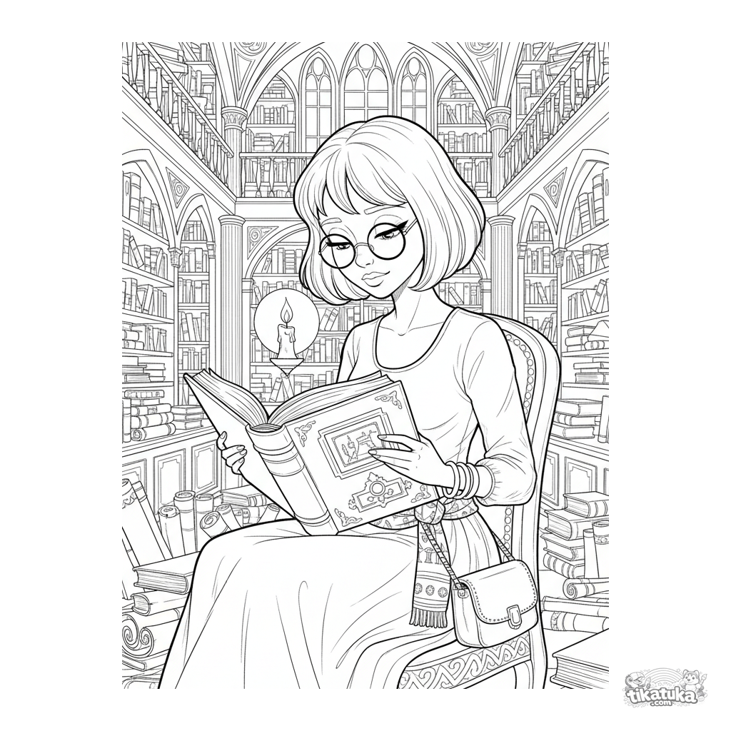 Página para colorir detalhada para crianças mais velhas 10-12: uma princesa erudita com óculos lê um tomo gigante numa biblioteca antiga.