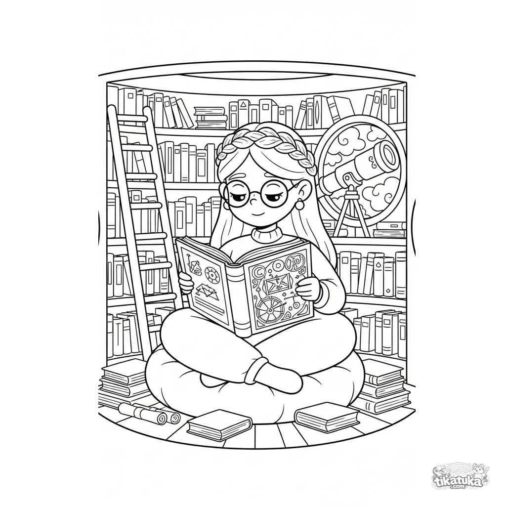 Página para colorir para crianças 4-6: uma princesa erudita com óculos lê um livro gigante em uma torre de biblioteca redonda.