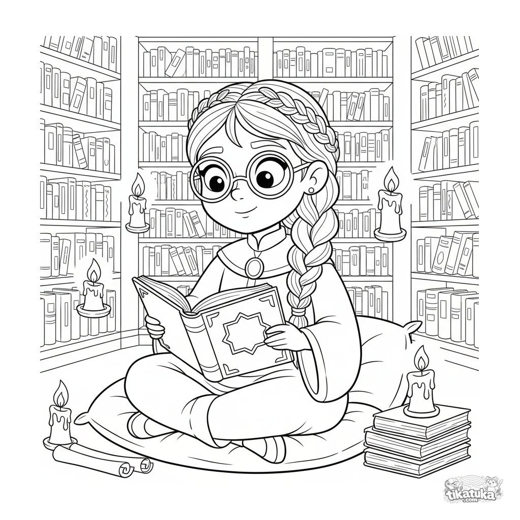 Página para colorir para crianças de 7-9 anos: uma princesa erudita lê um livro mágico em uma torre de biblioteca antiga, cercada por pergaminhos.