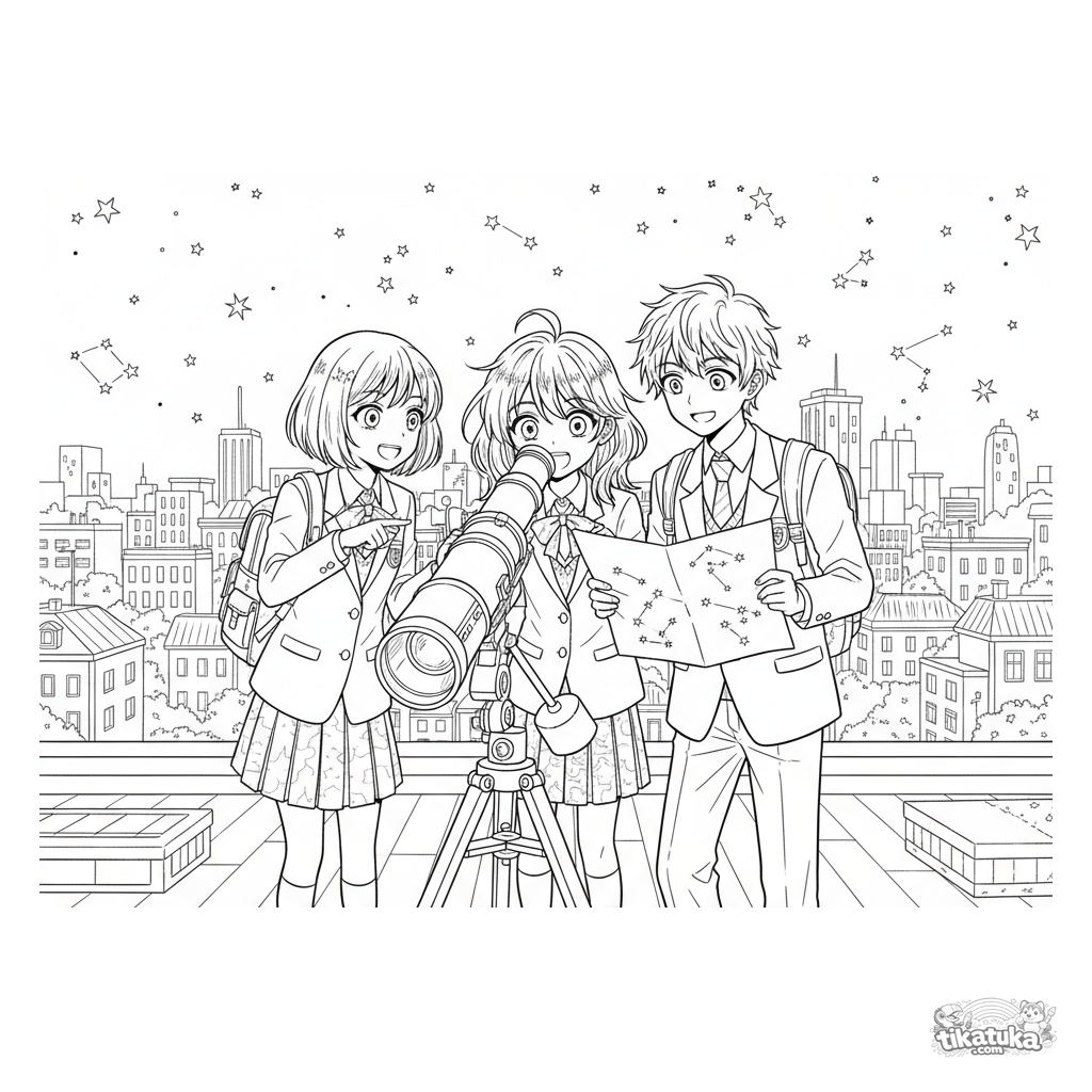 Página para colorir estilo anime detalhada para 10-12 anos. Membros de um clube de astronomia escolar observam estrelas do telhado, usando um telescópio e um mapa de constelações.