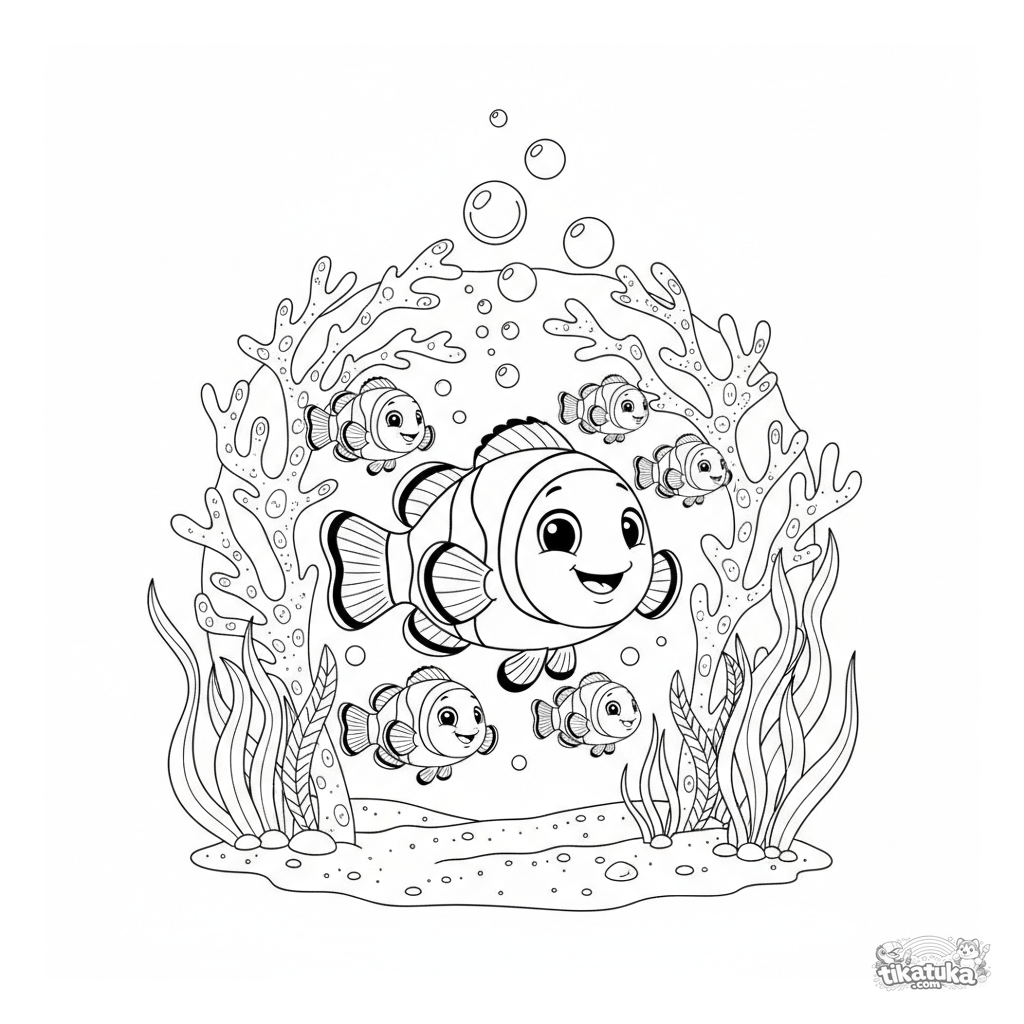 Página complexa para colorir para crianças de 7-12 anos de uma cena subaquática. Um cardume de peixes-palhaço alegres nada por um túnel de coral com bolhas e algas. Muitos detalhes, estilo cartoon.
