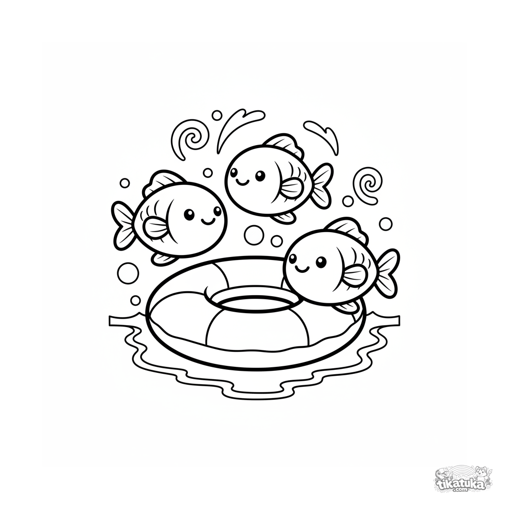 Página para colorir para crianças de 7-9 anos: um cardume alegre de peixes nada em círculo ao redor de um anel inflável no fundo da piscina. Contornos limpos, estilo de folha de adesivo plano, composição simétrica.