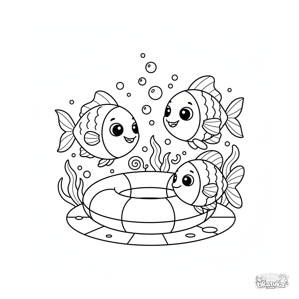 Página para colorir para crianças de 7-9 anos: um cardume de três peixes sorridentes nada em círculo ao redor de uma boia no fundo da piscina. Estilo vetorial plano.