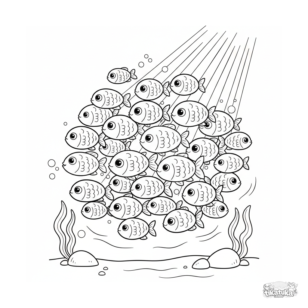 Página para colorir de um cardume dinâmico de peixinhos prateados brincando em um raio de sol em águas rasas. Para 7-9 anos.
