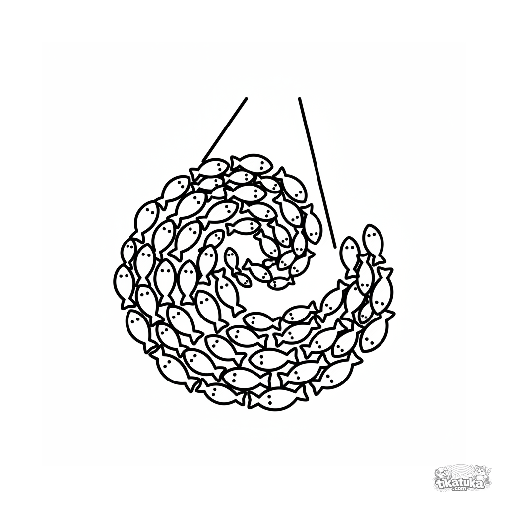 Página para colorir muito simples de um cardume de peixinhos girando em um raio de sol em águas rasas. Para crianças pequenas de 2-3 anos.