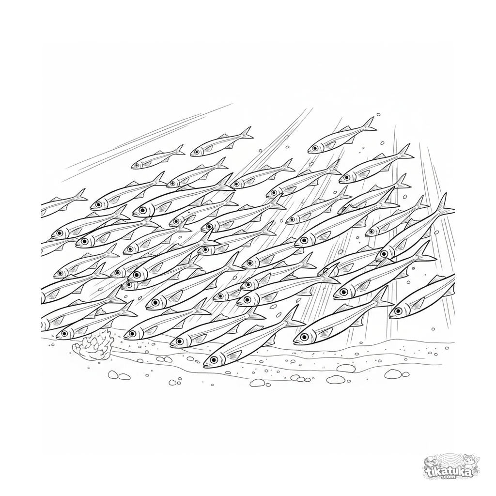 Página para colorir de um grande cardume de pequenos peixes-prateados nadando através de um raio de sol em águas rasas. Para crianças de 4 a 6 anos.