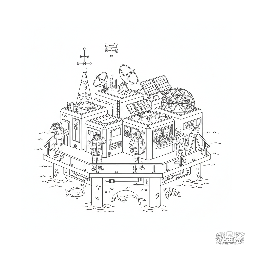 Página para colorir: uma estação de pesquisa científica detalhada em uma plataforma flutuante no mar para crianças de 10-12 anos. Com instrumentos, antenas, painéis solares e cientistas trabalhando.