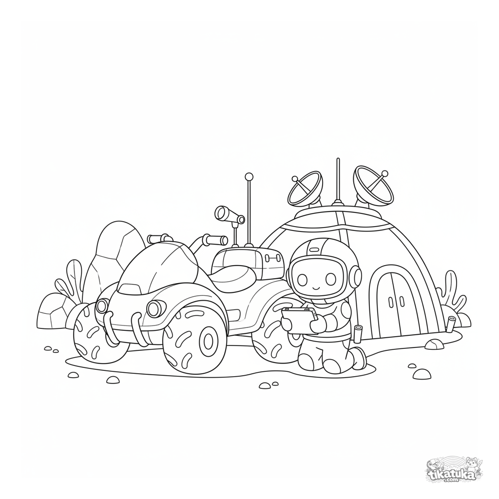 Página para colorir para crianças de 4-6 anos: um ATV de reconhecimento futurista está estacionado junto à barraca de comunicações do quartel-general de campo. O batedor verifica um dispositivo de mapa.