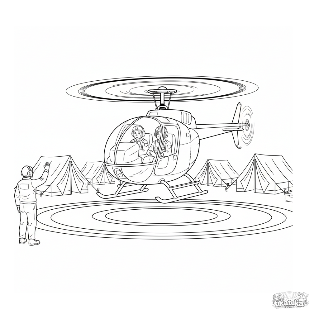 Página para colorir detalhada para 10-12 anos: um helicóptero de reconhecimento pousando perto de um quartel-general de campo. Contornos limpos, proporções realistas, cena com equipe.