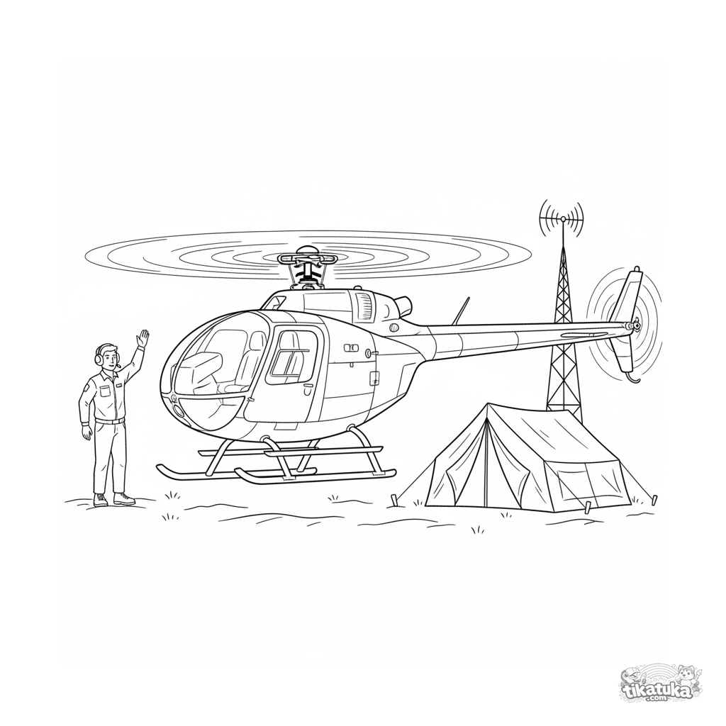 Página para colorir detalhada para 10-12 anos: um helicóptero de reconhecimento pousa perto de um posto de comando de campo. Estilo realista para meninos mais velhos.