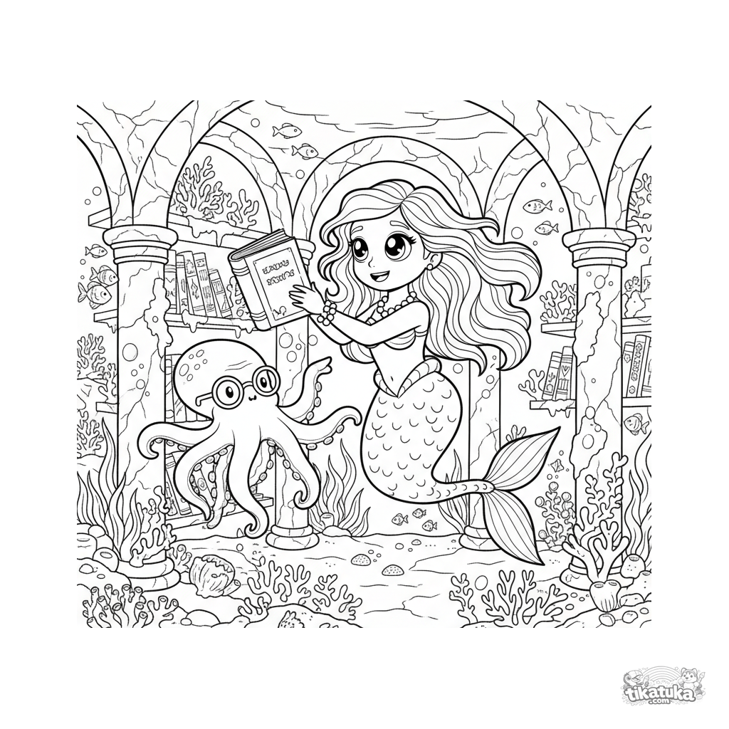 Página para colorir para crianças de 7-9 anos: uma princesa sereia explora uma biblioteca submersa com um polvo bibliotecário. Cena submarina mágica.