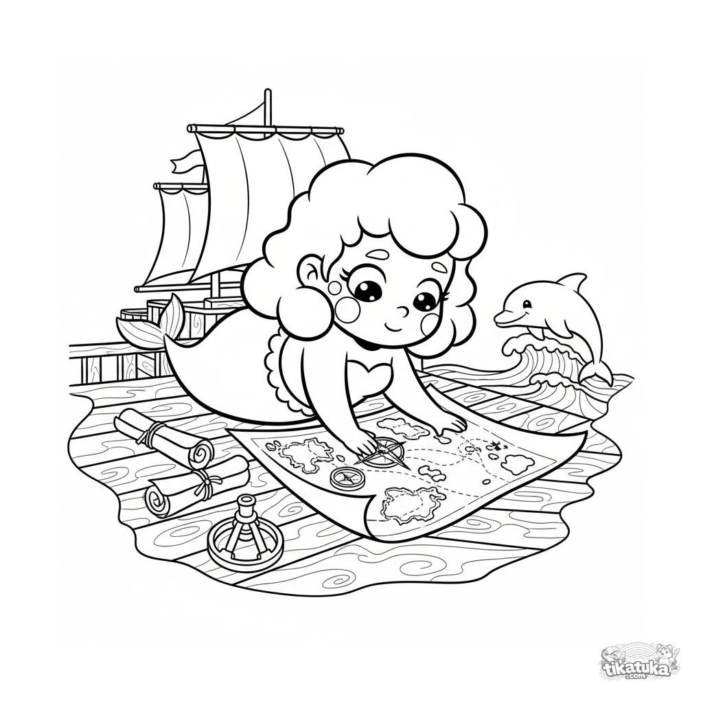Página para colorir para crianças 4-6: uma princesa do mar com escamas nas bochechas trabalha com uma carta náutica no convés de um navio.