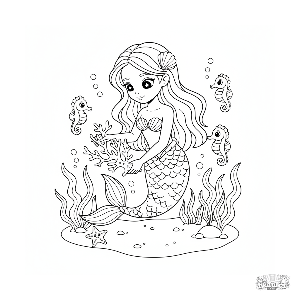 Página para colorir para crianças 7-9: uma princesa sereia do mar cuida de um jardim subaquático com coral brilhante.