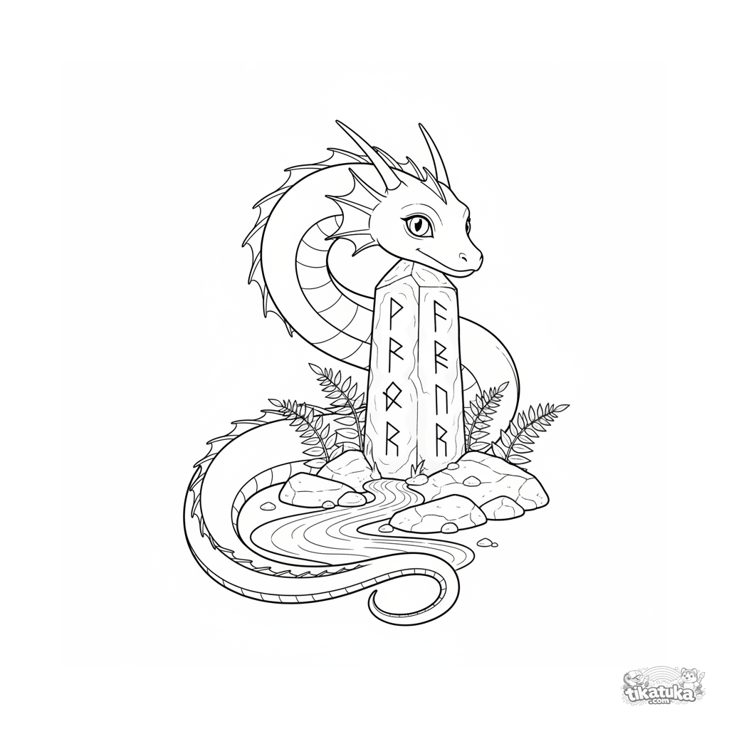 Página para colorir para 10-12 anos: uma serpente marinha detalhada se enrola em torno de um antigo monólito rúnico perto de um riacho. Cena em estilo naturalista para coloristas experientes.