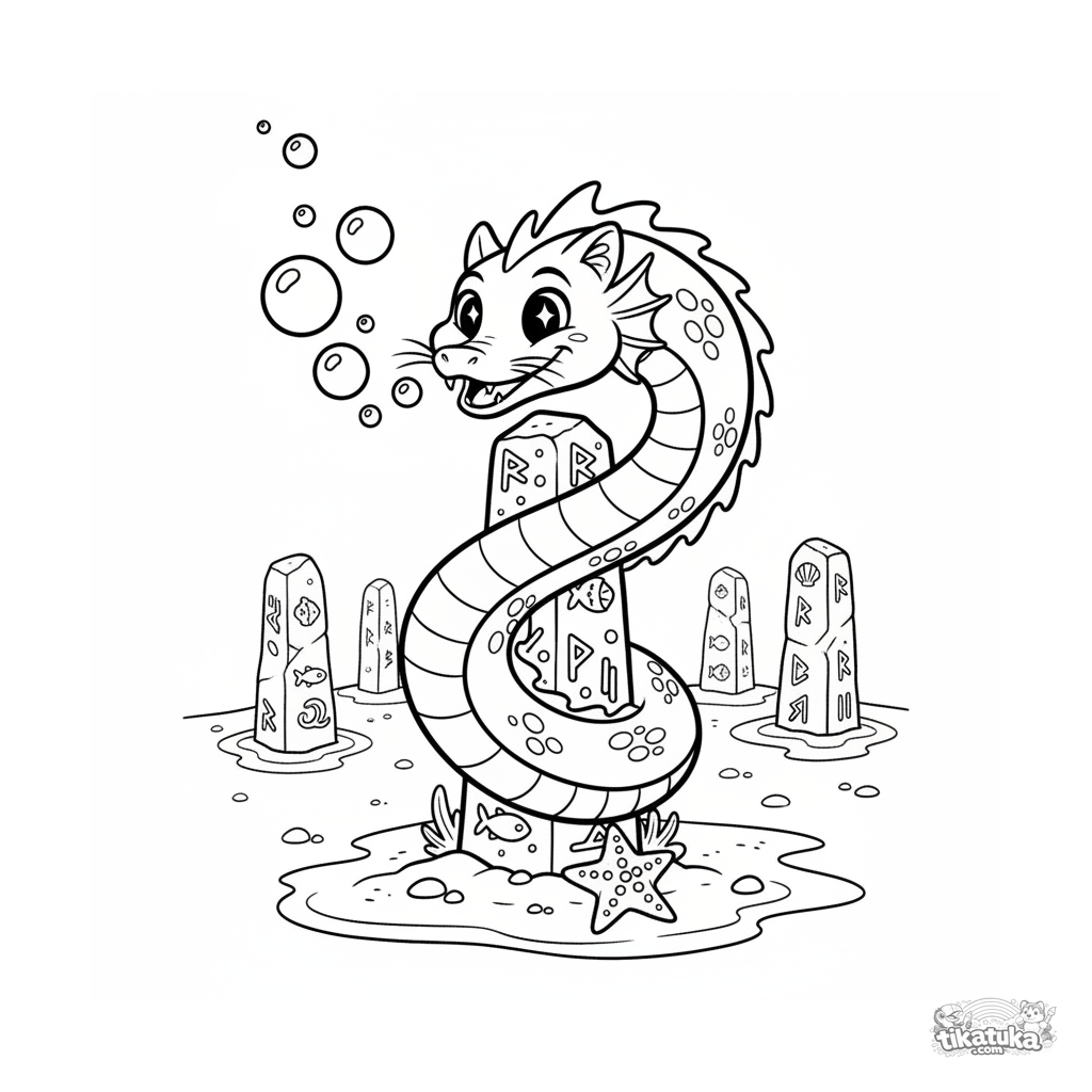 Página para colorir para crianças de 4-6 anos: uma amigável serpente marinha se enrola brincando em um monólito rúnico em uma lagoa.