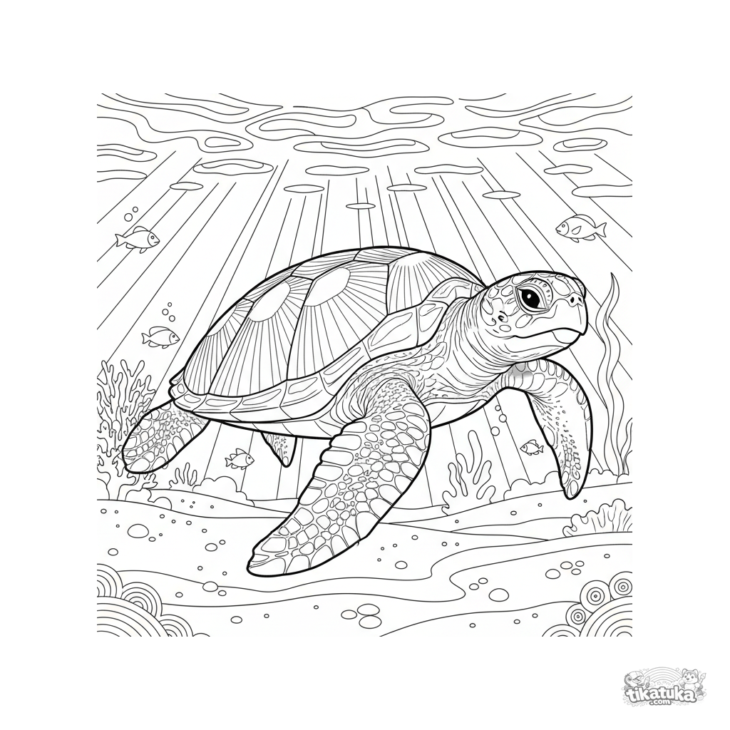 Página para colorir de uma tartaruga marinha nadando em águas rasas ensolaradas. Para 10-12 anos, imagem detalhada com areia e padrões de luz.
