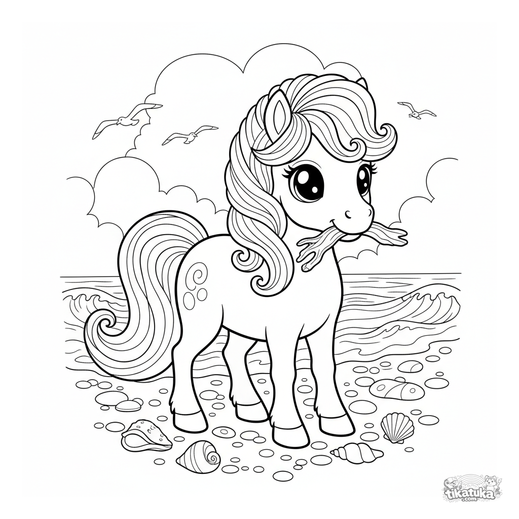 Página para colorir de um pônei mágico de espuma do mar coletando madeira à deriva em uma praia nevoenta. Para meninas de 4-6 anos, cena tranquila à beira-mar.