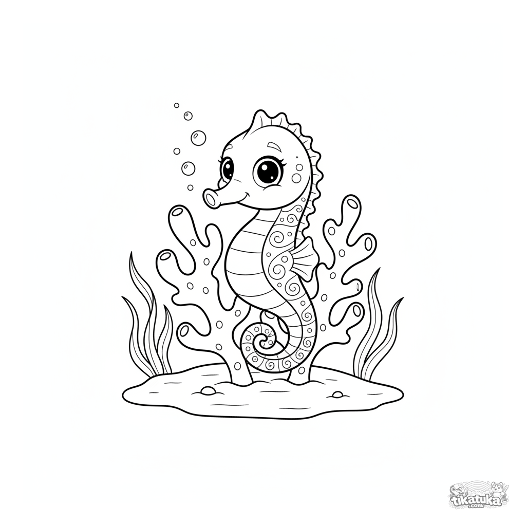 Página para colorir para crianças: um cavalo-marinho enrolado no coral numa lagoa. Detalhe moderado do mundo subaquático.