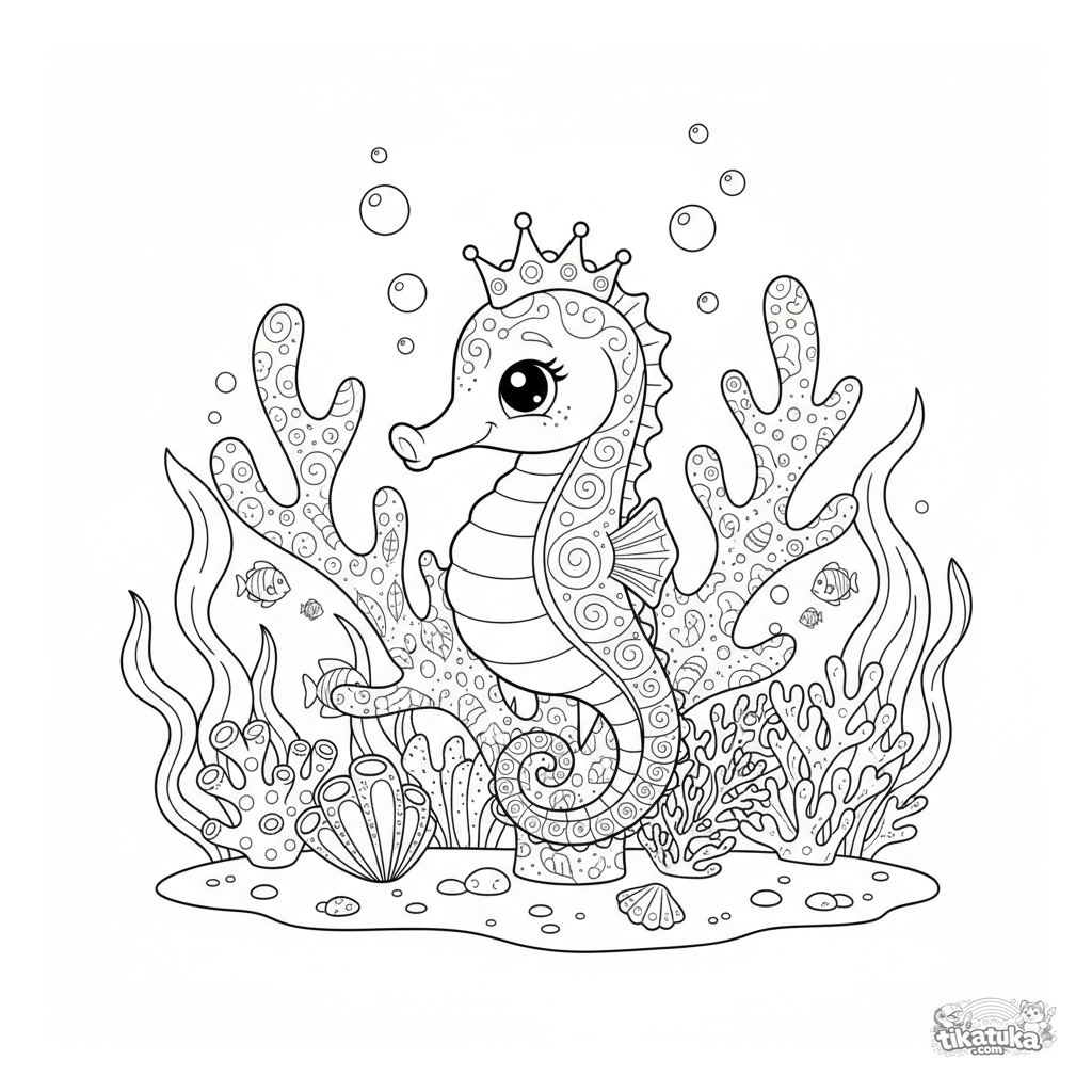 Página para colorir detalhada para crianças de 7-12 anos com um cavalo-marinho. A criatura graciosa está enrolada num coral ramificado num colorido recife subaquático.