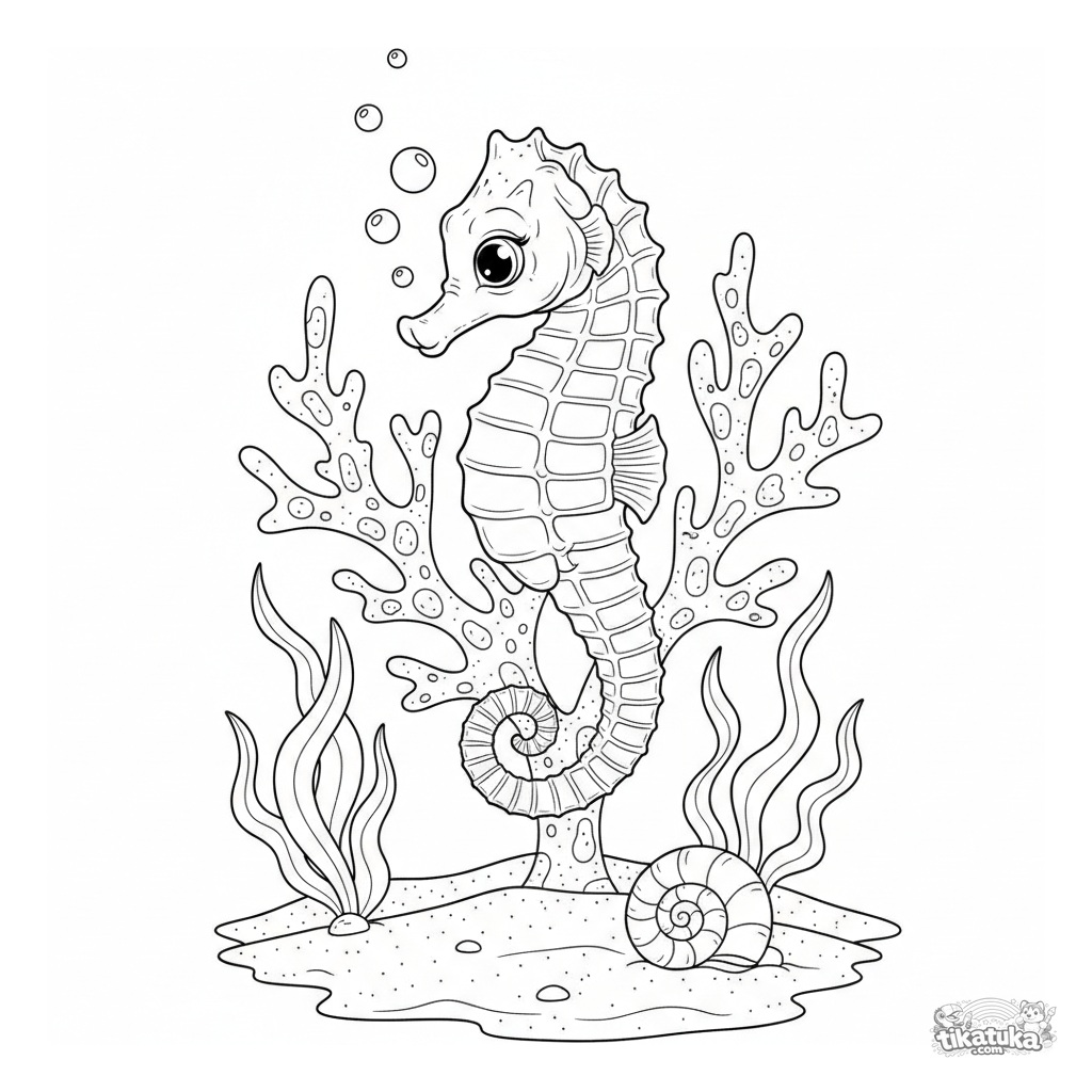 Página para colorir para crianças mais velhas 7-12 anos: um cavalo-marinho detalhado enrola-se num coral num jardim subaquático iluminado.
