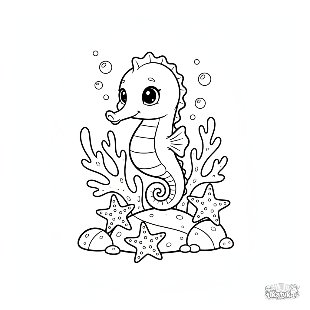 Página para colorir de um cavalo-marinho em um recife de coral para crianças de 4 a 6 anos. O cavalo-marinho enrola-se em um galho de coral com bolhas e estrelas-do-mar.