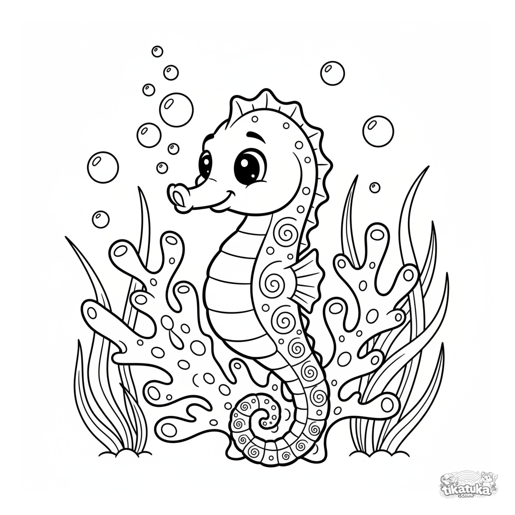Página para colorir de um cavalo-marinho amigável enrolado num coral. Para crianças de 4 a 6 anos. Cena subaquática com bolhas e algas.