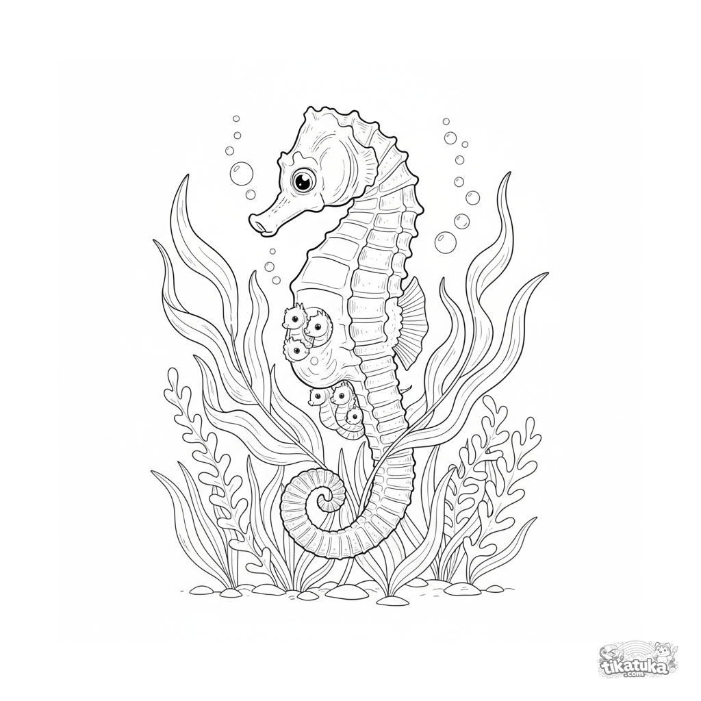 Página para colorir detalhada de um cavalo-marinho pai carregando bebês em um jardim de algas ensolarado. Para 10-12 anos.