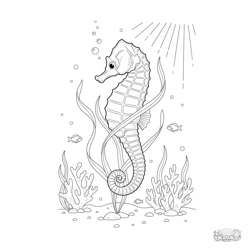 Página detalhada para colorir estilo gravura vintage: um cavalo-marinho pai em algas no raso ensolarado. Para 10-12 anos.