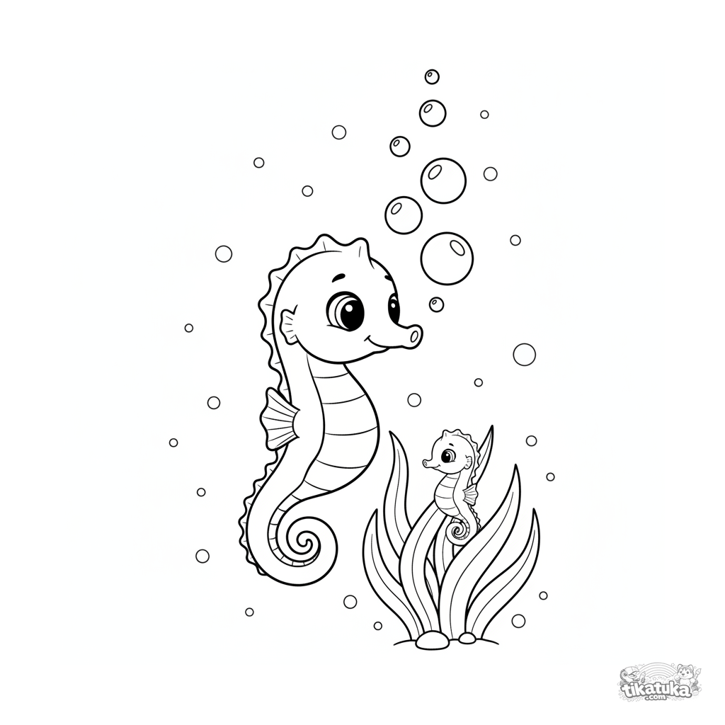 Página para colorir para crianças de 4-6 anos: Uma família de cavalos-marinhos nos raios de sol em águas rasas entre ervas marinhas.