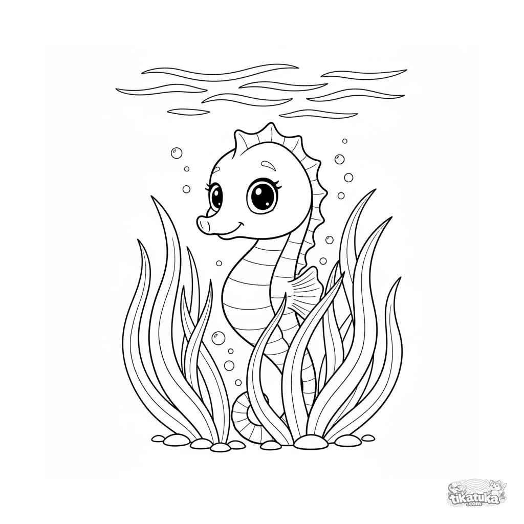 Página para colorir de um cavalo-marinho se escondendo na grama marinha em águas rasas e ensolaradas. Para crianças de 4 a 6 anos.