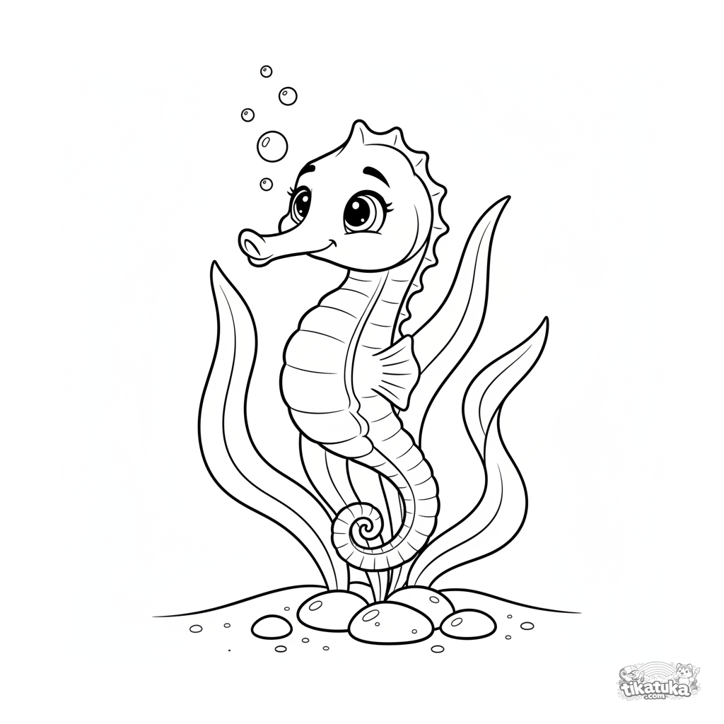Página para colorir de um cavalo-marinho pegando carona em alga flutuante em águas rasas e ensolaradas. Para crianças de 4 a 6 anos.